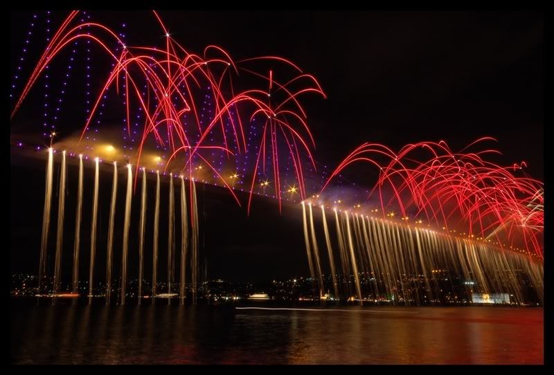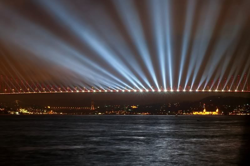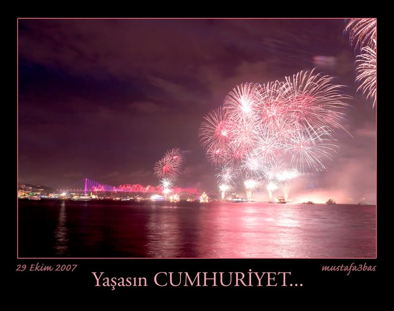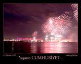Вчера тут такое шоу устроили, в честь 84-ех летия Турции. Ровно 30 минут, безостановочно (иногда даже посекундно по несколько минут) около 200 лодок прямо в пролива Босфора, бомбили феерверками. Весь город всё это время стоял. Мост через Босфор уже давно подсветили, а тут сделали так, что в какой цвет окрашивался мост - такого цвета запускали феерверк.